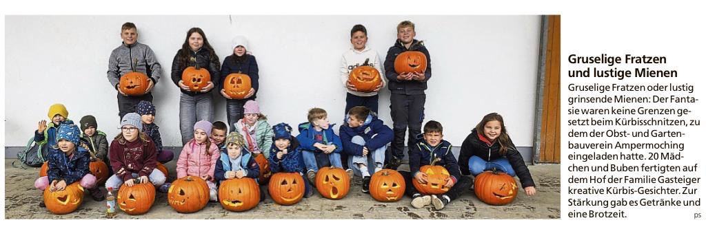 Gruselige Fratzen oder lustig grinsende Mienen: Der Fantasie waren keine Grenzen gesetzt beim Kürbisschnitzen, zu dem der Obst- und Gartenbauverein Ampermoching eingeladen hatte. 20 Mädchen und Buben fertigten auf dem Hof der Familie Gasteiger kreative Kürbis-Gesichter. Zur Stärkung gab es Getränke und eine Brotzeit.